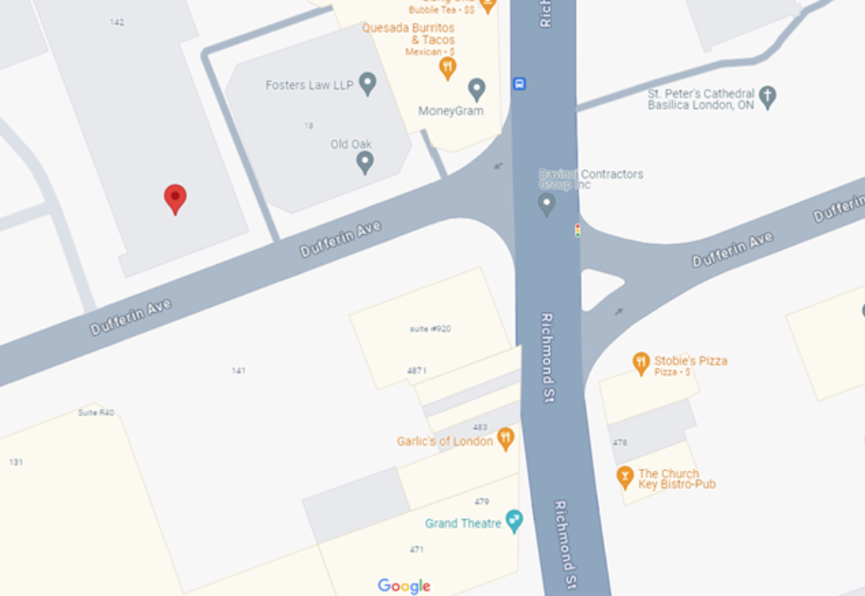 The Old Oak Parkade is located on 150 Dufferin Avenue (across the street from the large mural on the Grand Theatre's north side). (Please note that Google Maps may show the parkade location as 148 Dufferin Ave. Both addresses will take you to the right place!).